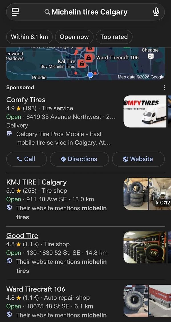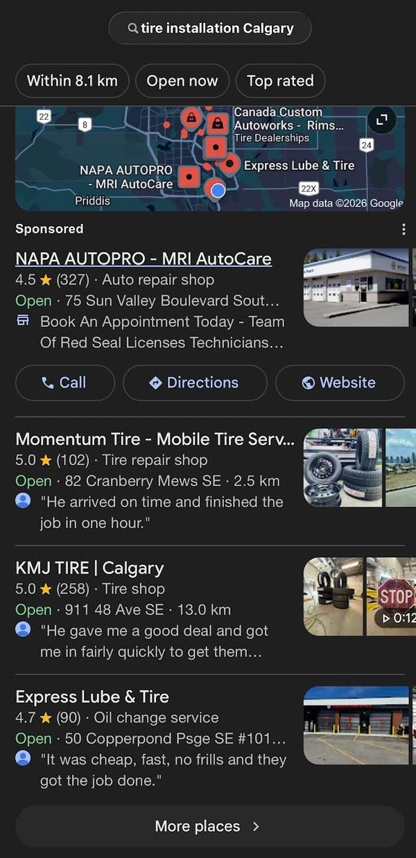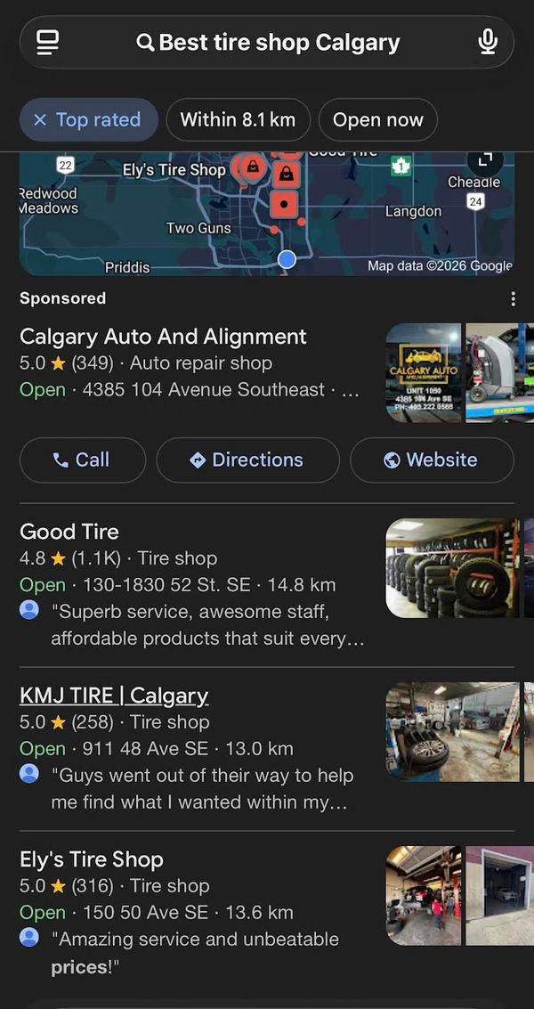 “Best Tire Shop Calgary” is a trust-based, high-intent search where Google heavily weighs reviews, engagement, and brand authority — not just distance.